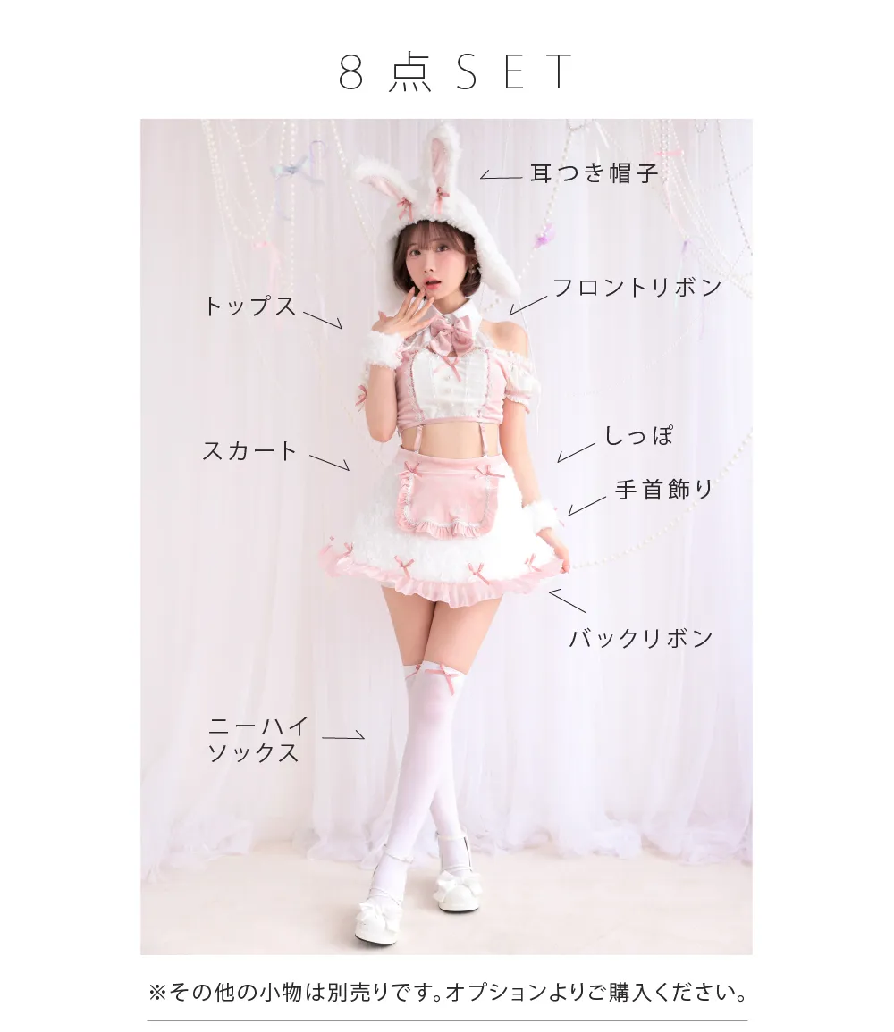 耳つき帽子・トップス・フロントリボン・手首飾り・スカート・バックリボン・しっぽ・ニーハイソックス
