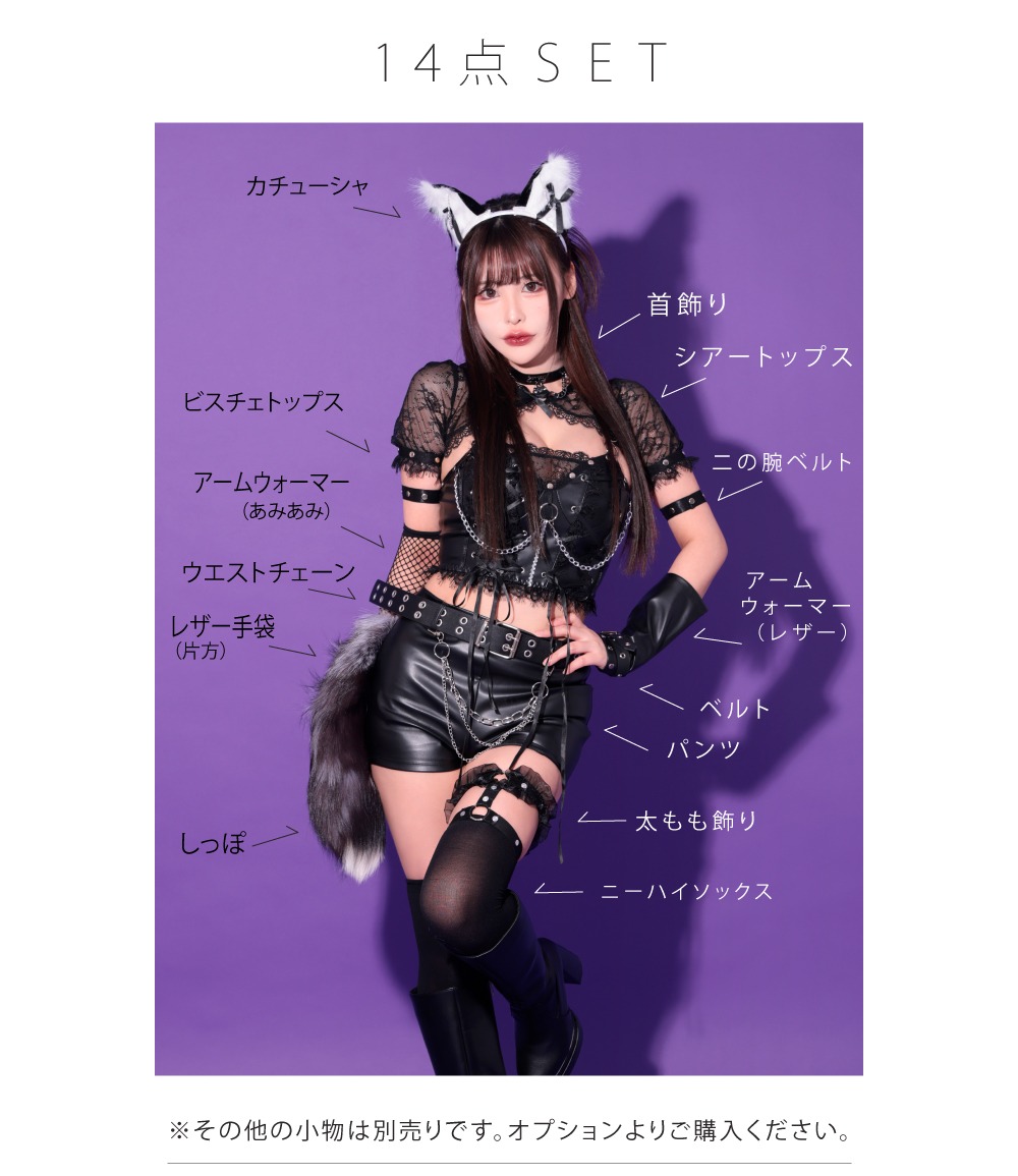 うさ耳カチューシャ・首飾り・シアートップス・ビスチェトップス・二の腕ベルト・レザー手袋(片方)・アームウォーマー(レザーとアミアミ)・腕用ベルト・パンツ・しっぽ・ベルト・ウエストチェーン・太もも飾り・ニーハイソックス